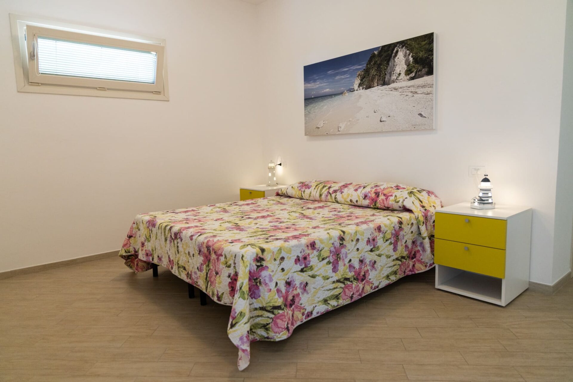 The one-bedroom apartment in the Gerbera complex features a double bedroom and a living area with a double sofa bed, providing comfort and convenience. It also includes a bathroom and a terrace with a sunshade, table, chairs, and sun loungers.